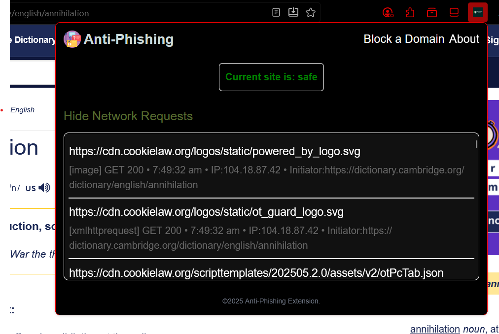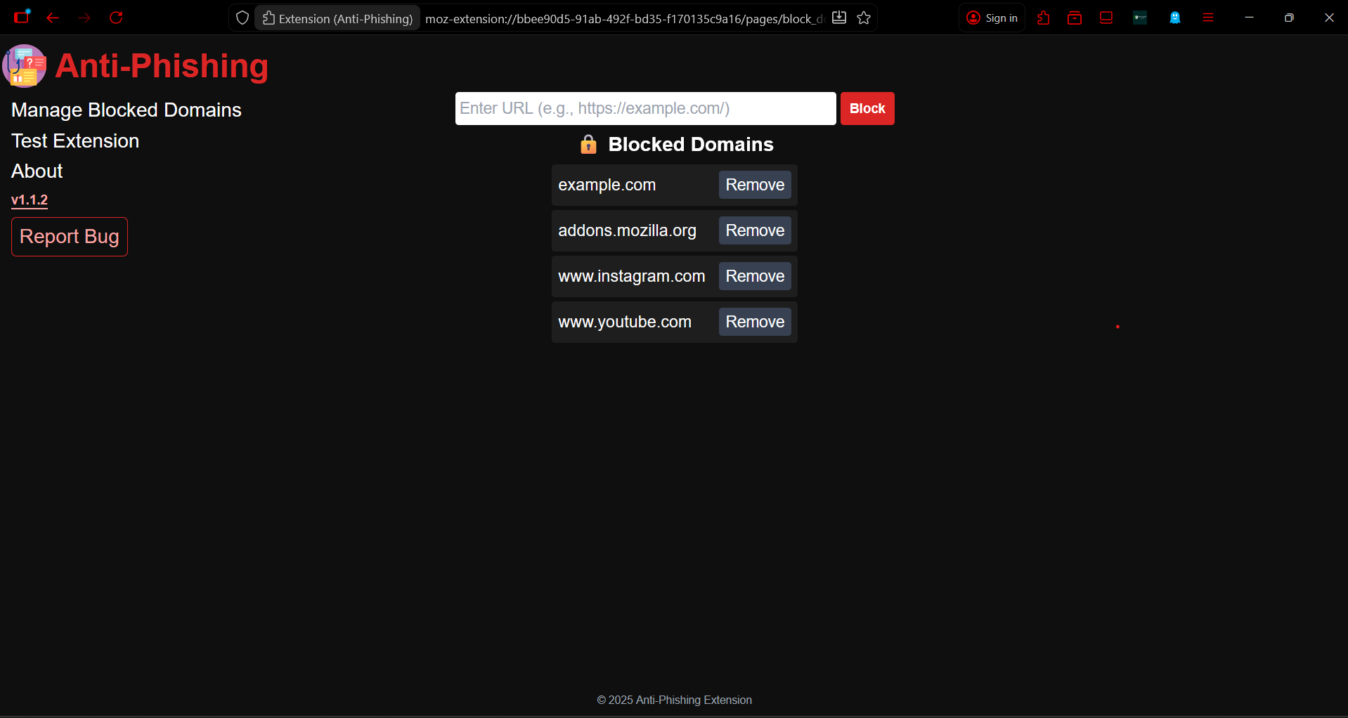 This is a browser extension-based project which detects phishing websites in real-time and alerts the user, uses rule-based approach to effectively identify and prevent phishing attacks, spam, and defaced websites. Users can also block and manage custom domains